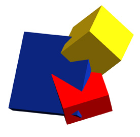 The cubes above are in a three-quarter (3/4) view. Each edge of each plane in the 3/4 view has it's implied vanishing point. How do you know that? Since we're not viewing any cube straight on, perspective distorts each face of the cube: the edge closest to our eye is the largest. Every other part of the cube then is going to be farther away. Notice how the back edge of the blue planes in all the picture looks smaller? If you did a sighting of the cube as it's drawn on this page you'd quickly see those more distant edges are smaller than the edge of the plane closest to you. (I say "as it's drawn on this page" because that's the trick of drawing: reducing three dimensions down to two. In the physical world, you still know the cube is equal in size along all it's edges. ) So again, you know if you inspected the cube in your hand, it'd be plain that all the edges and faces are the same size: "hmm, the front does looks bigger than back...I'll spin the cube then all the edges will take their turn being the apparently biggest edge when it's closest to my eye". That's introducing distance - the third dimension - when you have the perceived changes in size. About the only place this doesn't happen is on flat paper when you're drawing just two dimensional shapes. Check out this illustration - the edges closest to your viewing eye appear the broadest (the eye automatically perceives the biggest edge as the closest):