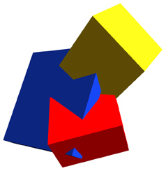 Getting more complicated Why go into all of this? Because vanishing points can be confusing at first. I'm only going into this because if you understand the simple version of vanishing points, it's a very small (though sometimes seemingly complicated) leap to finding vanishing points for converging lines off rectangular or cube-like objects that won't intersect on the "normal" horizon line or straight up in space or down into the middle of the earth. So what happens to vanishing points that aren't cuboid and aren't resting flat on Mother Earth? And what kind of objects might have those kinds of characteristics? And when might that happen? Well, it happens on the face, (but the good news is you really don't have to worry about all that - just understand that perspective will run those pesky lines together), and it happens any time you spin those little cubes around into an orientation that's not resting flat on good old earth, like these: