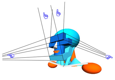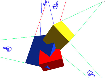 Cubic planes Ok. let's go. I'm going to start you off with an involved question: can you envision the vanishing point(s) of the blocks that make up the forehead shape, the cheekbones, and the chin in the head shape you see just below? However, there's more than just horizontal vanishing points. What are horizontal vanishing points? They're, well, the vanishing points that land on the horizon. (Note the italicized horizon.) Confused? That's OK. But there's more going on than just those. Just for now try to leapfrog on the information you picked up in the Flash Intro. Hint: mentally draw lines off the edges of these different blocks just like you saw in the spinning head review above. Give it a whirl. Just remember that when working with vanishing points and foreshortening, the part of the object closest to you is made larger. That means any part of the block that's farther away will be perceived as smaller. And if you go far enough away, these lines - drawn off the edges of the blocks - shrink to nothing: they vanish. Thus "vanishing points". This is especially true and most easily demonstrated when working with blocks, or Blockheads. :-) Which is why we're using these simple shapes in this exercise. So, warm-up exercise number one: envision the implied vanishing points (vp) by extending lines from the forehead block, cheekbone block and the chin block to their corresponding vanishing point on the head shape above in as many planes as possible. Did you come up with something like this: