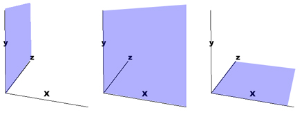 Stretch a table cloth between between the x and y axiis and you have the front plane (the middle illustration); stretch a cloth between x and z axiis and you have the floor of our cube (the illustration on the left above). If anything, you can now picture the planes of a cube.