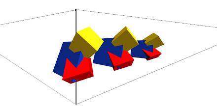 All that just to convince you that objects don't have to have vanishing points that lie on the horizon line. Hopefully you've got some idea now that all vanishing points don't have to point to the same horizon line. Only if the object itself (like a building), lies firmly on terra firma (the ground), and it's cuboid will it have vanishing points on the horizon. Now, if you have a row of objects in space like this: