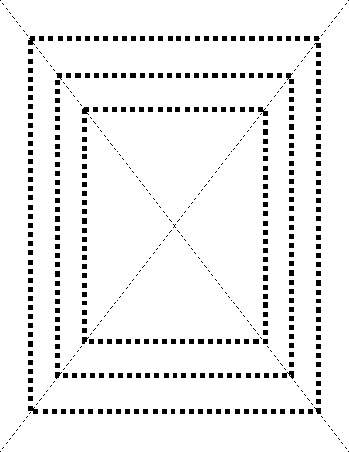 Here's how I drew mine: 1. Take an 8 and 1/2 by 11 sheet of paper. 2. Draw diagonal lines from corner to corner. 3. With a ruler, draw a horizontal line about an inch down from the top margin of the page. 4. Where it crosses the diagonal line on the left side of the paper, make a mark. (Any mark will do - you just want something to sight on so you can draw the vertical line the same distance from the left vertical margin of the page.) 5. Now, starting at this intersection of the horizontal and diagonal lines, draw a vertical line down to the next diagonal line (it's going from the lower left corner to the upper right corner). I.e., you're drawing a line parallel to the left edge of the paper. 6. Your vertical line should intersect the diagonal line approximately the same distance from the left edge of the paper as did the intersection you made in step 3. (You could compare the distance from the mark you made in step 4 to the left edge of the paper, to the distance the intersection of the vertical and diagonal lines in step 5 are form the left edge of the page. They should be roughly the same distance 7. Draw a horizontal line parallel to the bottom edge of the paper from the intersection formed in step 6 to the diagonal line ( the diagonal that courses from bottom right to top left of the page). You're 3/4ths done. 8. The last line you draw is from the intersection in step 7 to where the horizontal line at the top of the page crosses the diagonal. There. You've gone around the horn. My explanation was tougher than just doing it. But model any of the dotted lines above and it's pretty self-explanatory. |