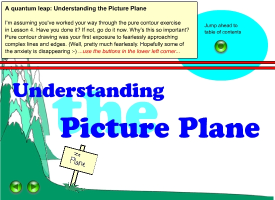 Note: Due to the way the Flash Lessons are constructed and due to limitations within Flash technology itself, the links contained within the interactive lesson point to the online book (links of the "http://www...." type). All the same pages those links aimed at are within the book in front of you. For your convenience, the links contained within the Flash Lesson "Understanding the Picture Plane" are repeated in their order of appearance within the table below. (Specifically the right half of the table - just read the headline for each column :-) Further, they're linked to the book as it sits on your computer - they won't open a browser and you don't need a web connection to open them. What a deal :-) If you want to see if any new additions have been made to the online page, go for it and click on the links within the Flash Lesson. If you want to access those pages rapidly, refer to this list: