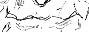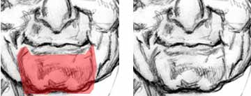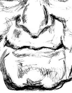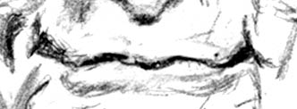 The point you should be getting here is that even though the uniqueness of a person's features are very subtle, they can always be identified. Sometimes they jump right out at you. Other times, you need to literally go through all the basics of drawing to pinpoint what is peculiar to your subject (i.e. looking for hints in lines, edges, contour, positive form, negative shape, shadows and highlights). This zig-zaggy shared edge of upper and lower lip is a defining feature of Hugh Hefner (in my opinion). The lines and triangular shadows at the corners of Hef's mouth are also very unique to him - and all people have these lines or suggestions of them. They're due to the different stresses the underlying musculature apply to the skin and fat layers above. Moving on to the chin We've pretty much moved from top to bottom through our