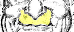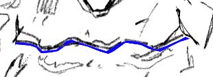 Isolating the contours of the upper and lower lip In this next illustration (just below), the upper lip alone has been isolated. In the pictures immediately following that I've outlined the shared edge of upper and lower lip in blue, and then isolated just the contoured version of the shadow shape of the upper lip. Notice how the contoured shadow shape at the lower edge of the lower lip is all that's needed to create the illusion of both upper and lower lips (Best seen in the illustration B with the blue contour - ).
