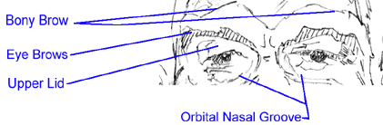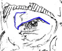 1) Scroll back and forth to the top of the page to compare the shading that's contained within and above the contour line of the brow. Note how it suggests the brow protruding towards you. And if my drawing doesn't suggest that, note how your brain interprets it as at least suggesting that.