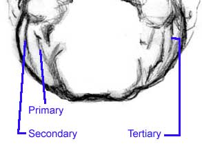 Layers and layers I used to find it very difficult to count my way through the vertical lines (the dimples), on the side of the face. Now they're different person to person of course, but it seems there's three to four you can identify in almost everybody. Those four are: 1) The primary dimples - these are the lines that arise behind the triangularis muscle; 2) Next come the secondary dimples - these are often little "comma" shapes that mark the base of the "cheek" cheeks (what we were calling "cheeks" above). Often they run right up to the corners of the eyes and down to almost the chin 3) Then comes the tertiary dimples - the skin folds behind the primary and secondary folds that the buccinator piles up between in front of the jaw bone. (remember, the buccinator dives deep behind and underneath the jaw bone).