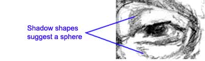What clues us there's a sphere there? Mostly it's the two shadow shapes in the upper and lower lids. Shadow shapes are as much of a feature as eye color, or ear size. They're absolutely unique to the person and because they suggest secondarily an underlying shape - which can be muscle, a layer of fat, bony prominences, etc. - and are every bit as important as the obvious part of the feature. Take home message: every detail of information suggests uniqueness. Sometimes, as in this case, the feature we're looking at - the shadow - is subtle, but uniquely Hef.