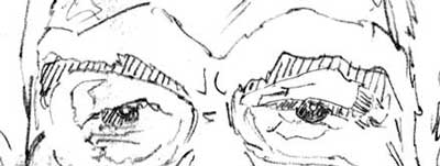 When there's too much information, squint or take a step back. This can collapse one, two, even three layers of complexity into one manageable one. Let's back up ourselves here, get an enlarged view - i.e., get a little more real estate into the picture. In this next illustration you can see there's a slightly larger section of Hef's face visualized. It's also been minimized for simplicity's sake. By minimize, I mean I've taken out the detail and just added contour eyes, brows, lids, etc.. (Truth is I just traced it - and traced just the major shapes at that.)