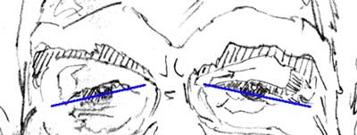 Shape of the upper lid 4) Next, observe the orbital-nasal groove. We're concerned with that because it's an important landmark in distinguishing the eye from the cheekbone and nose. (Look two pictures above to where it's pointed out in blue.) The point I want to make in this next illustration is this observation: there's an "axis" to the eyes - some people have eyes that appear to slant up, and others have eyes that slant down. By "axis" I mean the angle at which the eyes appear to sit at. More specifically it's the perceived angle formed between the upper and lower lids. (If the eyes are truly round, it's impossible to slant them right? - They'll always appear right side up.)