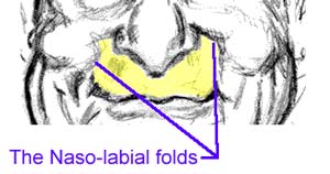 The Apron of the Upper Lip For your convenience, the naso-labial fold is pointed out in this next illustration. It runs from the side of the the upper most portion of the nostrils (or nares), and shares an edge with the cheeks. It grows more profound with time and age; in youngsters it's almost nonexistent whereas in somebody 100 years old it literally extends right off their face (because the skin is literally is hanging off their face).