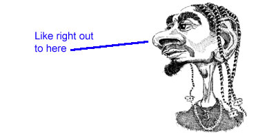 Line 1 points out the upper margin of the cartilage of the tip of the nose. On Hef, this point is over halfway up the whole height of the nose. (On the "average" nose, this midpoint is about at the widest point of the long and narrow diamond shape in the nose's center.) Note also how long this middle section is in comparison to the middle section of Hef's nose. In a profile view (a side view), the most protruding part of both noses would be at about where line 2 touches both drawings. This would be at the "tip of the tip" of the nose. The space between lines 1 and 2 give you an idea just how much larger Hef's bulbous tip of nose is proportionately much larger when compared to the average tip of the nose. In a profile, the tip of the tip of the nose, and that's no misspelling, is the foremost or just below the foremost part of the nose. Let Snoop Doggy Dogg help illustrate that point: