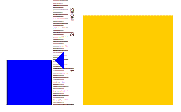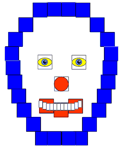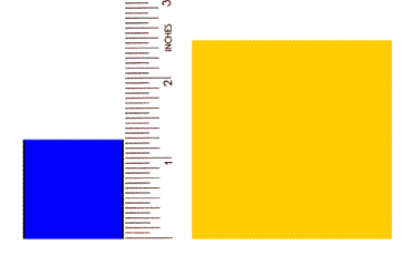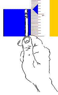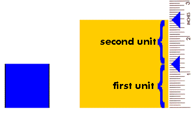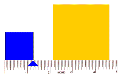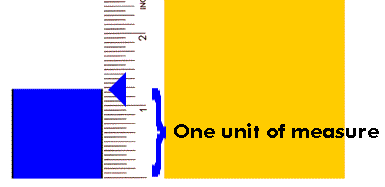 How can you relate the blocks? Place whatever you've chosen to measure with - your thumb, a ruler, a piece of paper - and place it against the computer screen. Put your measuring instrument right on square 1 - the little blue one- or try viewing it so square 1 is between your fingers. Mark it's top edge and it's bottom edge on the piece of paper if that's what you're using to measure it. I've used a ruler here. We'll be using the length of the side of the blue block as our "unit of measure". (We could just as easily have used the orange block to do this. Our unit of measurement would have been in fractions when we applied it to the blue block - and that would have been fine too. You'll be doing that in other pictures when your unit of measurement is larger then the object you're sighting. We'll keep it simple for now.) In this next picture, we've placed a ruler next to the blue square. (As you'll see in a second you could've just as easily used your pencil and thumb for the measurement. Just want to show there's more than one way to skin a cat.) 1. Getting ready to measure the blue block It's pretty easy to see the blue block is just about one and a quarter inches tall. As you can see in this next picture, the one and a quarter inch line is the next medium width line above the blue arrow: 2. Marking off the length of a side of the blue block Like I mentioned above, you could have just as easily used your pencil or thumb (at the end of your outstretched arm) to make this measurement. There's flexibility in how you can make a sighting. Just know what you're using for comparison. Using your pencil to sight the blue block Since this will now be our unit of measure we're going to call it that. What do call this length we've just sighted? It's our unit of measure of course. In fact it's one unit of measure. We're just arbitrarily calling it that because it's a unit of measure that makes sense for the objects we're relating. 3. This is one unit of measure Now move this measurement alongside square 2, the orange one. (I.e. move your fingers, or the paper, or the ruler, or your thumb and pencil - what ever you've chosen to use.) How tall is it in comparison? About twice as tall right? Simple enough. And since our unit of measure also happens to be almost one and a quarter inches tall, the orange square is two times that, or almost two and a half inches tall. 4. How many units (or blue blocks) tall is the orange block? Now do the exact same with the width of square 1. Compare it's width to that of square 2. If the blue block had been a rectangle laying on it's long side, your measurement would have been greater than one unit. That is, you'd have had "1 and 1/4th" or "1 and 1/8", or "1 and 1/5 and a hair" blue block units. Now go back and watch the animations in Part VI and see if they don't make more sense to you. There the unit of measurement is the table width - it's left side to be exact. 5. Doing the same for the width Lastly, compare the width of square 1 with the diagonal of square 2. Don't get thrown here, I said diagonal. I know - small curve ball - you have to rotate your measurement, the blue block 45 degrees in order to make an accurate measurement. Would you agree it's roughly 2 and 1/2 times the width of the little square? "Sight" it. Do it for your self. Using the little block as the "unit of measure" was an arbitrary choice, but it made sense, right? You could have easily chosen the large square and you'd be able to relate and compare everything to it. This is just a primer on proportion, but the idea is this simple: in anything you'll be drawing, this simple idea will work for you. What you choose as a basic unit of measurement will become obvious, easy, and changeable. Let's use a little more complicated example. So when you come to sighting a face like the following, you can see that that the little blue block was a good choice for a unit of measure.