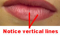 Dividing skin from lip: the vermillion border On to the lower lip Notice a feature of all lips but best demonstrated in the lower lip: the vertical lines. With age, these lines extend into the tissue above and below the vermillion borders: