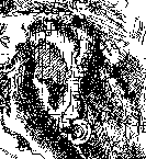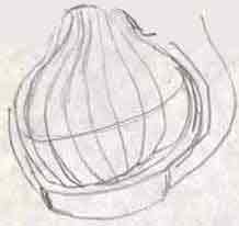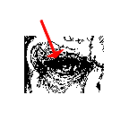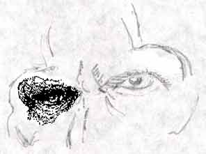 Rough of forehead and brow I notice I'm coming up with an almost monkey-like forehead, brow, and eye shape. Ok this is just preliminaries. We don't want to forget about keeping the depth around the eyes. Heavy lines, elliptical ovals and shadowing over the iris/cornea further this effect (see eyes if you've forgotten what the iris and cornea are): Arrow points to the shadowing Here, (just below), I've compiled the last two illustrations from above and layered them together in a single picture: