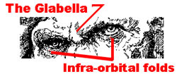 Understanding the face you're looking at: What's drawable? You can jump back and forth into character at any time while you're drawing - it's part of your grab bag. (This might not seem like a useful approach when you're drawing "live" - with your model right in front of you - all I can say is try it.) Right now let's get real objective and ask what's most drawable about Mr. Richards. You might start anywhere - I just chose the eyes because that's where I usually begin drawing when I'm drawing somebody in front of me at a party. The first thing that strikes me about Mr. Richards' eyes The first things that strike me are the deep set, almost sinister eyes. What characteristics give this look? For starters: the eyebrows come right off the lowest edge of the brow bone almost flipping around to the underside of the brow. Then there's the knotted skin of the glabella (the tissue between the eyebrows and above the nose), and all the little skin folds underneath the eyes. (These are called the "infra-orbital folds", or "bags".)
