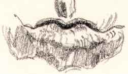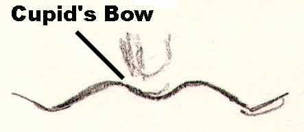 Ever heard of Cupid's Bow? A new anatomical feature: Cupid's Bow. Cupid's bow is the line the upper and lower lip make where they meet. Cupid's Bow is actually the contour - the shared edge - between the upper and lower lip. (You saw contour lines and shared edges in Lesson 4.) Here's "Cupid's Bow":