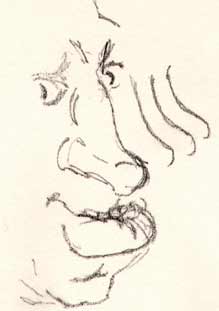 Protruding lip and underbite So that's the preliminary discussion of what I think are the two most noticeable parts of facial anatomy, (the area around the eyes/eyes, and the mouth. I chose to exaggerate the mouth more - other caricaturist's have focused more the eyes and came out with a masterful caricature.) Now we'll quickly glance at the remaining "soft tissue": the features that make Keith and the rest of us recognizable. Keith's Nose The next feature: Keith's nose. Keith has a very interesting nose. And I think I partially botched it - or I convey the wrong message. How's that you ask? This picture (the one at the very top) is deceiving: Keith actually has a curved nose that hooks a little to his left. If we view him 3/4's front view from his left (i.e. so his face is turned a little to the right like in the caricature at the top of this page,) his nose looks "hooked" at the top - like a Roman nose. In actuality, looking at him from his right, you can see he has a touch of angulation (it's crooked) and a bit of ski jump going there: that is, it slopes out, not down. (See illustration just below and at the "http" link - it'll be plainer there. For general information on drawing noses see: Lesson 11, Noses .)