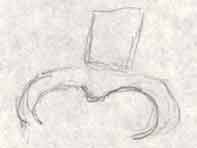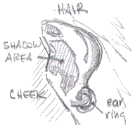 This places the nose above the midway point between eye line and bottom of chin: you can compare both the above for nose placement and size. In the illustration on the left, the dotted line that the bottom of the nose rests on is also the midway line of the lower half of the face. That is, it divides the lower half of the face in half. From now on, this will be the standard of measure we'll use when constructing a face while The Ears There's not a whole lot to be said about the ears here - Keith usually wears his hair long and so obscures his ears. Ah, one less feature to worry about! As a note, the ears grow with time - or more accurately, the ear lobes grow and stretch - especially if you're Caucasian or European. (I remember my Grandpa Al had some really big, long ears lobes. I guess I got that going for me too.) But in pictures where you can see K.R.'s, he's got the typical long ears of a European. (So we won't get out of drawing them after all.) As an accessory: Keith wears a small earring. I just clipped the left ear from the picture above. See if you can't identify the parts of the ear: the helix and lobe, the anti-helix, and the shadow area. Do evaluate where the base and top of the ear line up with the mouth and eyeline respectively. I've drawn a partial schematic in pencil on the right. (If you're at a loss about those parts-of-the-ear vocabulary, click here or on Keith's ear in the caricature at the top - it'll take you to the section in ears.)