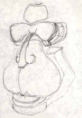Adding a nose Further, I've roughly started filling in the area where the eyes will go. And now I see where I went wrong with the cube around the eyes - the eyes are surrounded in an almost figure of eight kind of shape. But now I've lost some of the volume around the mouth. In this next picture I've got the volume back around the mouth and I think I'm solving the problem with the bones around the eyes - even though the shape around the eyes is crooked. (See it doesn't have to be perfect folks, we're just exploring here.) There're two arches in the eye area that are stand-ins for the eye brows. The nose has been left off, but that's ok, I know from the picture above where it goes.