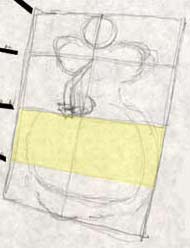 Now that we're getting a little feel for the volumes and shape of the head, we still need to ask this basic question: where do the features go? And that's where Mr. Average Face comes back into the picture. Where do the features go? Time to apply Mr. Average Face In the next set of illustrations, we're going to be applying the Mr. Average Face grid to the outline we've developed. The grid is comprised of the outlining format, (the rectangle that bounds the whole picture) a vertical center line, and three horizontal dividers. The horizontal dividers correspond to the: