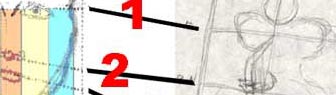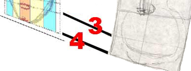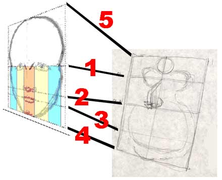 Comparing "Mr. Average" grid proportions to a Mr. Richards "rough sketch". Line 5 connects the horizontal top line of the format, Line 4 connects the horizontal bottom line. Lines 1,2, and 3 are lines we mentioned just above: the eye line, the base of the nose line and the lip line respectively. Had the grid drawing we did of Mr. Richards been exactly proportionate to Mr. Average, then all these lines would be parallel (or at least the distance between them would have been proportionate). They're pretty close in size and that makes the two comparable. Let's look a little closer. Looking at line 1: the Eye Line In the Mr. Average grid, (the face on the left), the eye line, (line 1) cuts the grid in half horizontally, right? But look at where line 1 in the Richards grid is placed - it cuts across at about the top one fifth of the grid - the distance between line 5 and line 1. Since the two pictures (average face and the rough sketch) are roughly the same size, the proportions should be pretty close - but then only if they're both "Average Faces".