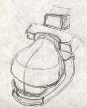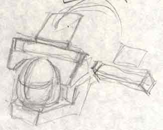 Quick Blockhead Sketch of Mr. Richards The above was my first attempt at trying to get a feel for the bony structure, for fitting them together. It didn't work too good, but it's a good review of the "blockhead" parts. (In the blockhead approach, remember we're trying to chisel down a cube to it's most essential parts: the forehead, the cheekbones, the mouth and maxilla, the lower jaw. The nose is added later.) So since this wasn't a real great start, I tried sketching the head a few more times. It's not so much that I'm trying to get a likeness as I'm trying to get a feel for the volumes of the face and head. Next try Here's a view that captures volume better than the one above. If I squint my eyes and scroll between this view and the caricature at the top, the volumes are starting to make sense. There's' something around the eyes' and eyebrows that isn't quite right though. I haven't quite nailed down what it is but overall I'm closing in in it.