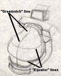 Here, the very next picture below, I've added a nose for volume's sake. Imagine the "Greenwich" line (or midline contour) as it courses over the topography of the face: it bulges at the forehead, recesses between the eyes, is the foundation behind the nose (the nose courses over it), it bulges out with the first 2/3'rds of the mouth and pulls back again at the chin.