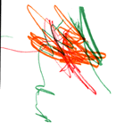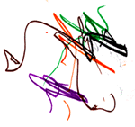 These two samples are typical of art children begin drawing at about age a year and a half ( and representative of what you drew at the same age). Drawings by this age group are random, spontaneous creations. The lines in them are linear to circular in form - probably because that's all the more coordination kids have in their small limbs. (Kyle likes abrupt direction changes and lots of contrast - on this day anyways. He sent me other art that's all circles, but it was yellow and didn't scan into the computer very well.) The discovery that you could make marks, that you were the captain of your creation had to have been a powerful ex- perience. Just watch a child in this age group concentrate as they make their masterpieces. (Who knows what's going on inside their brains?)