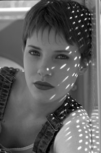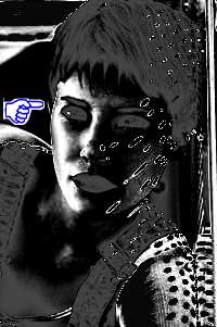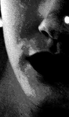 This is an example of pattern recognition - something your right brain is a natural at. Try seeing the shape as all three: first as upside-down Bart, then the Mohawk kid, then for what it really is: the young woman. Doesn't this remind you a little of the "Vase-Face" picture in lesson 1? and a little of the Negative Space / Positive Object" exercises? in lesson 6, and lesson 7? It's the same exercise essentially. Even though we're looking at a specific shape, you're extending a general skill - the general skill of perceiving shapes, except now you're seeing shadow as shape. Play with jumping between the shapes as any of the three interpretations. Do you feel the change at each switch? It's kind of entertaining actually. (To me anyway - I hope for you too.) That's your R-mode muscle getting stronger. Part of the bigger picture And here's a further neat fact about this particular shape and this exercise: the shape of this shadow is unique to the shape of this particular woman's face. I know, that's obvious. But let me try saying this a little differently. If you were our subject and we clipped a picture of the exact same section of your face in the exact same same light and applied the same PhotoShop effect, we'd get the same tones but an altogether different shadow shape - a shape that would express the unique topography of your face and yours only. And you would recognize it, and your friends would recognize it, and anybody who has the pleasure of seeing you in person and seeing the cropped photo of you would recognize it as you too. That's the pattern recognition part. One level of it. Before you saw the Bart-like shape above as the unique shadow of a woman's face it was just a peculiar shape. Now, after seeing it as part of larger picture, you can interpret the shape as anyone of the interpretations we tried. Still, the biggest shift, the subtle mini-explosion of a shift, comes when you recognize the woman without benefit of seeing the rest of her face. In fact, it's as if you see the rest of her face subconsciously. Look at the next picture, (it's the same one with a tad more information). Do three things: 1) perceive the woman's face and 2) switch between seeing the "Bart" character and the "Mohawk" kid. 3) Be conscious of the subtle shift of perception - of how it felt in the instant of changing between interpretations of the shadow shape. Play with jumping between the shapes as any of the three interpretations for a few more seconds. Strive to feel the change at each switch. Starting to feel it now? a little? That's your R-mode muscle getting still stronger.