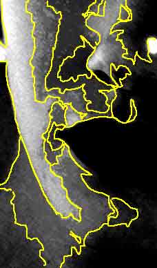 Play with squinting until the the grays match In order to do the contour map of the woman, (the one with the yellow outline), I looked at the the same image in PhotoShop and squinted until the major areas of shadow looked like unique individual shapes. I outlined each separate contour and shape with the PhotoShop pencil tool squinting the whole time. But you don't need PhotoShop to do this. What you need is this skill so you can do the same with a pencil, a pen, in a sophisticated computer program, in the snow at 10,000 feet, or in the sand at a Pacific ocean beach! (Which, just for fun, is getting pummeled by 15 foot waves, high winds and 2 inches of rain under deep purple clouds on this February, 2000 Winter day. I love it when it rains in Southern California.) (back to top) More Practice If you're feeling ambitious, look over these different contrast pictures of the same photograph. I want you to try to visualize different areas of value as unique shapes. I'll even further push you to try and scribble out a few of these areas on some drawing paper. Don't' get hung up on doing the whole picture - just focus in on an area and try to draw particular shapes. Use the same steps you used above. I'll give you little hints below on what shapes to zero in on each picture.