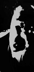 In photo 1, draw the shape of the lightest gray: the shoulder that's up against the window in the lower right corner. Observe closely the shapes of the elliptical light shapes coming through the screen and landing on her hair, face and shoulder. Observe the shapes of light at each area of transition: from hair to cheek, and cheek to shoulder. In photo 2, zoom into the shape of the eyes, nose, lips and mouth. Observe how much roundness you attribute to the face, forehead and chin with only almost no shade information. Now squint and look for the unique shape that's formed by the shadow between her eye and nose - no lines there, just a subtle shadow. In photo 3, observe the shape of the highlight running down the entire right side of her face, (on the side with the pointer finger). Also notice that when you squint, this picture changes from a near negative to resembling photo 1. Photo 4 is the untouched original. Squint and see if you can't see the basis of the more extreme shadow shapes of the other pictures. Single out small sections and see if you can't identify what's similar and what's not in each area. Ask yourself "what is it about each of these photos that allows me to recognize them as the same person?". Two last exercises Lastly, using the "upside-down effect" to get R-mode more involved, tape tracing paper to your computer screen and, while squinting if necessary, outline the major shadow shapes of these two pictures. (Flipping the two upside down will make them that much more unrecognizable - which pulls your artist mind back into the picture.) And as a very last task, trace the large picture below, (the "last picture"), in it's right side up orientation. You can go after this with as many shades of gray as you like. If you feel frustrated, that's OK! keep working through it. Part of that is L-mode wanting to control the assignment again. If the picture looks too complicated, squint so tight all you see is one or two values of gray. We'll be coming at this from other angles below: lots more practice coming.