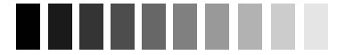 Tones and values Recognizing an area as shadow is a first big, (but relatively easy), step. Seeing the shadow and highlight as a constellation of one or more tones that forms a shape shape is a further extension of the same skill. To master that further step you'll also need to learn to differentiate between values - between the different shades of a tone. Values of tone. Making it a conscious skill to recognize the gradations of tone (or value) is the goal in this section. I through a lot at you there. Let me unpack this for you.................................... (back to top) Here's how I understand tones and values. Tone suggests color to me, individual colors. Values suggest a range of shades within that color. When we're dealing with shadow in it's purest from, we're dealing with the range of values between black and white. In the same way music is made of high notes and low notes, a "light" or pale shade of shadow has a "high" value; a dark shade is "low" in value. (Like music, "high" and "low" have nothing to do with good or bad.) Here's a value scale of grays from dark to light - or low value to high value: