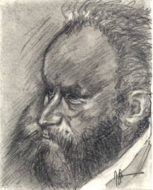 From black to white and nine shades in between The scale runs the range from black to white (the white of the background) in 10 steps. Ever seen those fax machines that have "256 shades of gray"? What that's referring to is the number of shades of gray between black and white. (That would be like adding 25 gradations of gray between each of the above boxes of gray. The human eye can distinguish several thousand shades of gray and millions upon millions of color shades.) Now look at the "Degas Copy" picture just above. Look closely at the darkest parts of the picture - the deepest shadows in the beard and eyes for instance. Now compare these dark shades to the different levels of shading in the forehead or the area of highlight just to the side of the nose above the upper lip. Jump back and forth between them and it'll become plain in a moment - consciously plain - that there's a difference in value. (You can do the same with the cowboy picture a ways up.) Mini-review: drawing skills build on each other Before we go any farther, I want you to be conscious of how the different skills you've been learning are building on each other. Keep this in mind as you go on from here: If your goal is to eventually do full color airbrushed caricature masterpieces you'd have to understand painting and color. In order to do that, you have to understand values and "light logic". To maximize your expertise in light logic you have to have a feel for proportionate relations. To understand proportion you need a foundation in shape recognition (as in negative spaces and positive shapes). To best decipher shapes, you need an eye for recognizing and following lines and edges. Reverse the whole thing: recognition/perception of lines and edges leads to shape perception, which leads to accurate perspective and proportion, which supports light logic, which makes value recognition a conscious skill which directly informs your ability to differentiate color, and, (big breath), leads to the ability to paint a big ol' full color Leroy Neiman masterpiece. Ain't no thing, right? So lets get back in that frame of mind - rediscovering your very own, developing artist's brain. Getting your right brain, (R-mode), back in the picture The side of the brain that's immersed in language - the verbal left brain - still resists and tries to altogether ignore incoming non-verbal data like shadows and highlights out there in the world. This was explained and demonstrated in lessons 1 through 6. This stubborn part of the brain has a hard time acknowledging the contribution R-mode makes in recognizing patterns and shapes. In order to make literally survival decisions out there in the environment, L-mode (the left brain) needs this kind of information. It must get this information from somewhere. R-mode is forced to make it's contribution very subtly. Like a humble servant who doesn't want to upset the king, R-mode can't upset the dominance of L-mode without coming under fire or being rejected. It's got to feed L-mode with influential, decision-aiding information on a subconscious level. Conscious control or R-mode L-mode is still "us": our conscious ego-driven mind. To draw like/as an artist, our task is to get R-mode operating independently. We need R-mode back under conscious control. How do we do this? Just as before: present L-mode with a task it either rejects or ignores and allow R-mode to subtly exert it's wonderful talents. Pattern recognition, shape recognition, tracing and sighting - these were some of the skills we explored directly and indirectly in earlier lessons designed to pull you into R-mode. Shadow recognition is a direct extension of these skills. We're going to jump right in. Here's a fun task for you. Look at this shape within a shape: