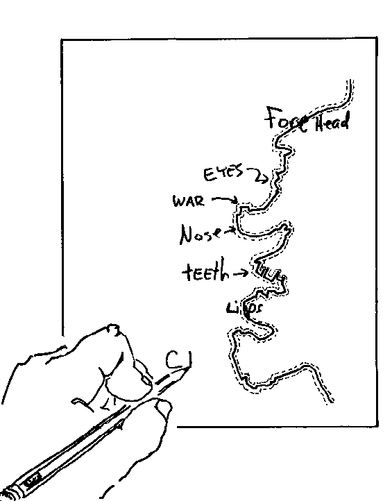 Face-vase number 2: Extending what you did in lesson 1- The "Ugly Face/Ornamental Vase" Hopefully you've completed lesson one. (If not I urge you to go back and do it right now! Buckminster Fuller had an analogy he liked to use for learning. Learning is like pole-vaulting: the higher you want to go, the farther back you start - but you cover the same ground on every new attempt. Bit by bit, you get where you want to go.) What we're trying you accomplish: Getting access to the visual, spatial R-mode, and training ourselves to access it at will. In this lesson, you'll be going a step deeper into seeing as an artist sees. Before you start drawing, please read the lesson through beginning to end. (The instructions to this are fairly short.) Step 1 Like lesson number one, draw a profile of a face. If you're right-handed draw on the left side of the paper (nose in the middle), If you're left-handed draw it on the right, nose in the middle. Except this time, draw the ugliest, bizarrest, wartiest, most deformed face you can conjure up. (See illustration just below.) This exercise is exactly the same as Lesson one with one difference: here you're trying to draw a face so ugly, so deformed that you've got to work at it to still see a face in it. See the animation from lesson I to reacquaint yourself with the general idea. Click for overview of Lesson I Animation Draw the ugliest face profile you can conjure up download or print these examples) Again draw from any pictures that might pop up in your head. Most of the time what you'll come up with is "stored" images of the left brain, compiled references. And that's just fine for what we're doing here. . pop Step 2 Like lesson number one, take your pencil and trace over what you've drawn naming all the parts as you go. ("forehead, lump on forehead, nose, wart, big mole on nose, swollen lip, pointy chin...etc.) Just make sure you name all the features and the odd parts as you go like the illustration: Trace over the