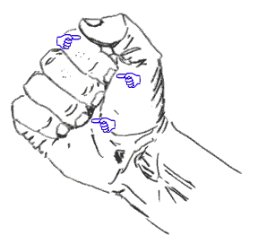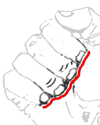 The pointers show lines demonstrating "shared edges" The shared edge is that line where the skin of my palm meets my fingertips. I can't see the end of my nail - it's partially obscured by the skin folds of my palm. That resulting line, that margin that's recordable in ink is the shared edge. There's shared edges all over the above illustration. Another one that's pointed out is the line between the thumb and the index finger. When you actually record this "meeting" of two entities, the shared line you observe that is, with a pencil on to your drawing paper, you've created a contour. A contour is... Contour: You can represent or describe the meeting of two objects or shapes (the shared edge) with a single drawn line - that's called a contour or contour line. A "shared edge" and a "contour" are pretty much the same thing - except, you regard the contour as a single thing. The difference is conceptual. When you consider a "shared edge", the "shared" part suggests more than one contributor - the edge made between your fingernail and your palm for instance. If you draw nothing else but the shared edge, i.e. draw the actual topography of that margin between your buried fingertip and the spongy part of your palm on a piece of paper, then you have a contour. You flip your attention to just the line formed by the coming together of those two items, and you're now observing a contour. How's that go again?