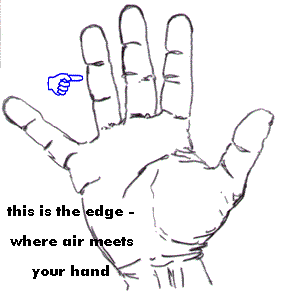 So the point of this is... Here's the point: all of these symbol systems - math, language, memory - all have stored meaning. All words, spoken or written, mathematical symbols, visual cues, anything we use more than a couple of times, for economy's sake become abstractions. Through repeated exposure they lose their status as unique experiences and become grouped into composites, into categories, etc. They become a veil or a substitute for direct experience. As necessary as these skills are in getting us through school, into a job, etc., they block us when it comes to creativity, brainstorming and, in our immediate interest: learning to see. Why? Because when it comes time to draw the particular instance of "white wicker chair with a beagle named Maynard napping on it" (that is if you're going to draw Maynard, an actual beagle, napping in an actual white wicker chair), we instead tend to see the general category of "chair with dog". We fall into abstraction. We miss the detail. Readin', writin' and 'rithmatic' are all L-mode areas of expertise. What we want to accomplish here is to learn ways to break out of L-modes grip, and get proficient at calling up R-modes greatly underutilized capacities. In this exercise, we're going to go even deeper into R-mode Kimon Niccloades, a well known art teacher developed this exercise. in "pure contour". (See The Bookstore). It worked. He thought it worked well because it caused students to use 2 senses: sight and touch. From what's been learned about left and right brain functioning and specialization of tasks, it seems that a more plausible explanation why this works is that this exercise throws you deep into R-mode. It forces you to minimize or omit any referencing step of figuring, comparing, analyzing, or making logical judgments - things the Left hemisphere of the brain specializes in. When I say "referencing" I'm referring to referencing your memory. In this exercise your concentration, your present-moment attention, in fact your entire nervous system will be focused on tracking directly any movement your eyes make as they inch along the curves, juts, and direction changes of a line contour, much the same way gravity locks a locomotive onto every turn of it's stainless steel railroad tracks. This kind of focused attention will pull you deep into R-mode. In fact this exercise will probably shift you deeper into R-mode than any exercise thus far. Possibly deeper than any exercise you'll do. New terms Edge: In drawing, an edge is where something ends and another thing begins - where two things meet. I'll illustrate. Look at your hand - hold it up in front of your eyes with fingers splayed and palm towards your face. With one eye closed, focus on the outline of your hand. There you are, looking at your hand with nothing but air surrounding it. The edge is where air meets your hand. It forms an outline.