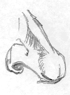 If you've done all the exercises in this lesson you can draw noses from memory - and they don't have to be perfect! That's the whole idea of caricature: realism with distortion. This should be fun. Let your hair down and go to it. You can do it! Congratulations! Go to the next section on applying the technique from "Vase/Face" to the nose. It's not nearly as long as these first three sections and it sets you up for a really fun exercise: cartooning the nose. In this section, you'll be concentrating on doing both left and right noses. Up to this point, all you've been drawing is noses viewed from the left. Vase/Face: left and right views