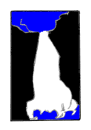 space colored Color the negative spaces with a marker or pencil. In this illustration I colored the top wedge of the nose blue - it's both part of the nose and part of the forehead. Since it can be viewed both ways, I decided to color it. It makes it a more recognizable shape. You can leave it white or color it - whichever seems to nail the point of negative space home better. Step 5 Now, stare at one of the shapes. Keep looking at it. Gaze at it until you feel it to be real shape - as substantial as any object on the page. Gaze at it the way you looked at the vase-face, (lesson 2) in the earliest lessons. Remember how it shifted back and forth from vase to face? And when it "popped" into either the vase or the face, recall how it suddenly was one or the other? You're working for that same effect here. Be patient, it may not happen instantly. It'll take L-mode a second to realize it's got no name or category for this thing - so it'll want to scan it's banks for some kind of association. Let it do what it has to. Eventually it'll get frustrated and allow R-mode to take over. And that's exactly what we want. Step 6