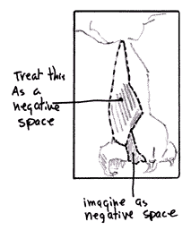 Step 3 Draw the "negative spaces" around the nose. Now begin drawing but draw the spaces, (just as they're pointed out in the illustration directly above). Concentrate on the spaces as if they were real objects. Sometimes you need to stare at the spaces for a moment or two and then magically, your mind accepts them as real - if unnamable - forms. (When you're done it'll look like this.)