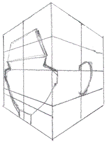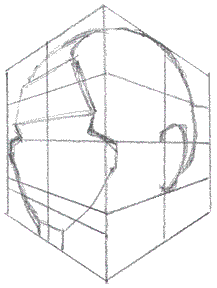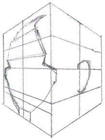 Making the head fit the cube Just previous to this section, you constructed the "miter box" for Mr. Johnny Average head. Now we're going to fill it. What we're going to fill it with is a partial face - a faceless head if you will. After you've filled this box a few dozen times, it'll be time to add the nose, and few extra features. Then you'll look at the head from a few different angles - I'm going to let you fill those in on your own. (Or you can just study them - you'll know what I'm talking about when we get there.). If you've been good about doing all the assignments, you've now built the necessary foundations to start stretching yourself - and you're more than ready to dive into portraits and caricatures. Congratulations! If you've played hooky a few times, then just recognize those areas you feel weak at and go tackle 'em - you will get them if you work at them. Filling the miter box: click here for gif animation
