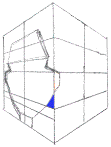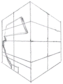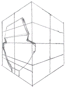 The finger in illustration A points out where the left cheek line crosses the base of the nose line. Pretty straight ahead, right? Illustration B shows where the the cheek line crosses the vertical edge or margin of the cube. In the next illustration, I want you to look at the area formed by the intersecting lines as shapes, that is, distinct, unique, up-until-now- unseen shapes. (Remember, I'm not just teaching you caricatures, I'm teaching you to access your own in-born artist skills.)