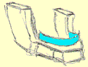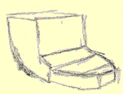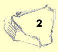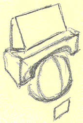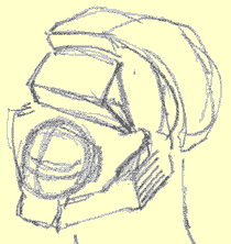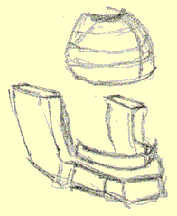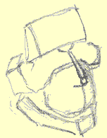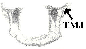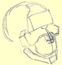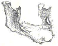 Out of this section, the isolated section, we're going to construct a jaw bone, and a cheekbone mass, and a cylinder - the cylinder of the maxilla. The jaw Let's start from the bottom and build our way up. Here's a jaw bone - the mandible if we're going to get all academic about it, (it's a fairly anatomical drawing): The Mandible As you recall, the mandible "articulates" with the temporal bone of the cranium. ("Articulates". That's the big medical word for describing where two bones come together and touch, like in a joint. Remember the song "Dem dry bones"?..."the foot bone's connected to the ankle bone, the ankle bone's connected to the shin bone..."? Well if we get academic about it, that song should go " the foot bone articulates with the ankle bone, the ankle bone articulates with the shin bone, etc., you get the idea. It is tougher to sing however.) Anyway, the mandible articulates with the temporal joint and forms the "temporo-mandibular joint" of TMJ fame. (This is review.) The point where the jaw bone touches the cranium Representing the jaw in "wood block" form In a three-quarter view, the mandible or jaw bone is an L-shaped undercarriage. If we give it the "chiseled from a block of wood" treatment, it might look something like this rough sketch: