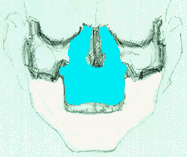 In the end, it'll fit right on top of the lower set of teeth and will extend from between the two cheekbones, (it's outlined here in light blue): The maxilla in blue