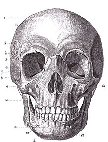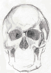 Let's recap some of the things you've learned so far: you've learned about the different ways of dropping into "r-mode" - the artistic modality of your brain. You saw that drawing upside-down pulled you into it, that pure contour was a method that lulled you deep into the here and now, the present moment of observation. You learned about negative space, angles and proportion. You saw the three drawable parts of the ear, the breakdown of the nose, how to capture the shapes and texture of lips, learned about the complexity of the eye. You got an introduction to understanding the underlying masses of the head in the lesson on lips and teeth. And all this brings us to this lesson: Shapes and Masses of the Head. In this section you're going to find a home for all those features you've been so busy drawing. And you know what? It'll be easier than you think because you've been absorbing this part of the anatomy piecemeal as you've been going. It's in this section I think you'll begin to experiment with caricature: you'll be getting a chance to play with proportions - and not run the risk of having to make perfect likenesses. (You can always do that if you wish.) It's at this stage some people may discover it's not portraits, or caricatures, or cartoons they want to master, it's developing their own characters (cartoon or altogether other arts like sculpture...you've been developing your own character all along through discipline, patience and dedication). The architecture of the head is truly amazing and you'll be getting some depth here, enough I think to carry you into doing likenesses. But still, we'll literally only be scratching the surface. You'll have the rest of your lives to add-to, or build even more artistic depth. What you'll be able to do by the end of this chapter: By the end of this section, you should be able to draw a "cubed-out" masses-of-the-head picture just like the one above. Not only that, if you do all the assignments in this section (and there's a lot of them), you'll have a template just about memorized in your head - not to draw "rotely" whenever you draw a head, but rather as an embedded (as in "embedded in your brain") template of comparison that helps you see into and through the model or subject you're drawing - anywhere or anytime. And I think that's a pretty powerful tool to have packed in your arsenal. Here's the game plan 1) Part I: Describe the skull - light overview of the bony anatomy 2) Part II: Front view, formats, and a "four line" approach. 3) Part III: Assignment one (Complete with gif animation) 4) Part IV: Side View 5) Part V: Working in three dimensions A quick "Masses-of-Head" sketch A word about "Johnny Average Head" This will also be a great time to start introducing "Johnny Average Head". In time you'll understand the why it's great to have an implanted standard in your own mind: it gives you basic units to compare the caricature or portrait you're drawing. With something to compare to, you'll have a head start deciding what and why a persons' features seem caricaturable or best left alone. The Bony Anatomy: a quick overview Here's' the skull in a front view: Front view of the skull I'm not going to get into detailed naming of all the bones of the face and skull in this lesson. It's just too overwhelming. And besides your observation skills will get you all the detail you need. I do want you to learn to recognize some of the major landmarks though. And these I've listed. I'll add more detail as needed in coming lessons.
