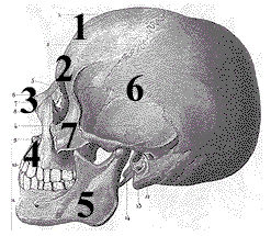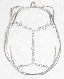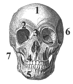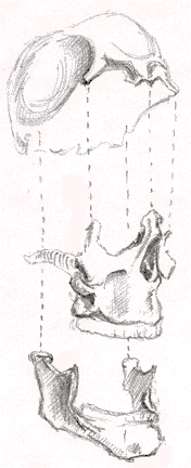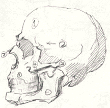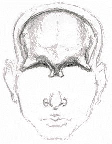 Name the bones (ignore the numbers) Here's a birds eye view of the skull: Top view of the cranium - In this view you can envision the roughly cubic, roughly egg-shape of the human head. The point of greatest width of the skull is roughly 2/3rd's of the way back. (Use what you know about negative space to observe the narrowest points of the area between the skull and the format.) The nose and cheek bones protrude farthest forward. Side note: Now what are those little squiggly lines? Those are the "sutures" or seams of the skull. They are the joints of the head. Humans are the only species of animal anywhere in the world who's babies are born with these joints unclosed. You know about a baby's soft spots right? Those are just the spots where the skull hasn't yet come together, hasn't fused. If you watch close at a baby's soft spot (most people are familiar with the one towards the front, right in the middle - but there are 3 others!), you can actually see a pulse - this is perfectly normal. Why be born with an unclosed skull? The skull is the biggest mass of the body at birth. To get through the birth canal without flexibility - "modeling" which is bending and moving of those joints - would kill both mother and baby. It seems we've been designed to have more brains than any other creature on the planet. And Mother Nature has made it so we finish this extra - and very risky growth - outside our mothers. If babies got any bigger than they already are at birth, no mother could withstand it. If babies were born any sooner, they'd be so fragile, they couldn't survive. Having all those brains can be a very dangerous thing. Nature's found a happy medium and a marvelous solution to building human beings. Divisions of the Head This next illustration demonstrates the head broken down into three anatomic sections: cranium, central facial bones, and jawbone. Don't get anxious, this isn't anything you'll have to reproduce (though I think you could), I just want you to understand it. Explodo-view of the Head: