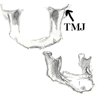 view Front view of middle section of skull What's left is the mandible or jaw. This is the only mobile bone of the skull. It contacts (or "articulates" ) with a small depression at the sides of the skull (at the temporal bone) It's called the temporomandibular joint: (TMJ) Isolating the Mandible and "TMJ" Breaking it down You've arrived at your first assignment. Draw everything up to this point. No, I'm just kidding, I wouldn't do that to you. You will be doing lots of drawing in this section though. Not to worry, I'm going to break this down into very recognizable and easily understood pieces. (I think they call this "chunking" in these corporate, MBA-obsessed days. ) I'm going to quiz you often and I'm going to be pretty repetitive: I'm going to drill this into your head so you can go on to be the next Kruger, or Hirschfield, or Picasso. Get your drawing pads out! Get lots of loose, unlined paper (any kind will do - typing paper, matte, brown paper bags, newsprint - it doesn't matter) and/or your drawing pad out. Keep them right at your side or in your lap.