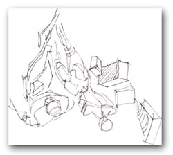Step 2 Take a minute to look at the illustration (this is upside down #2). With your eye, pick a line, any line and follow it to where it intersects another line, or disappears. Follow it from it's beginning to it's end. Notice areas that curve. Note how lines - when lines intersect - they do so at an angle. Compare those angles to the edges of the drawing. Ask yourself:
