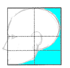 Now, we've begun the curve of the jaw in "9" and extended it all the way to the lower left hand corner in "10". The jaw - back of the head intersection is not exactly at the intersection of the of the base-of-the-nose line (which is now the "bottom-of-the-ear-lobe" line), but it's pretty darn close. The jaw roughly fills the lower left rectangle of the side view:
